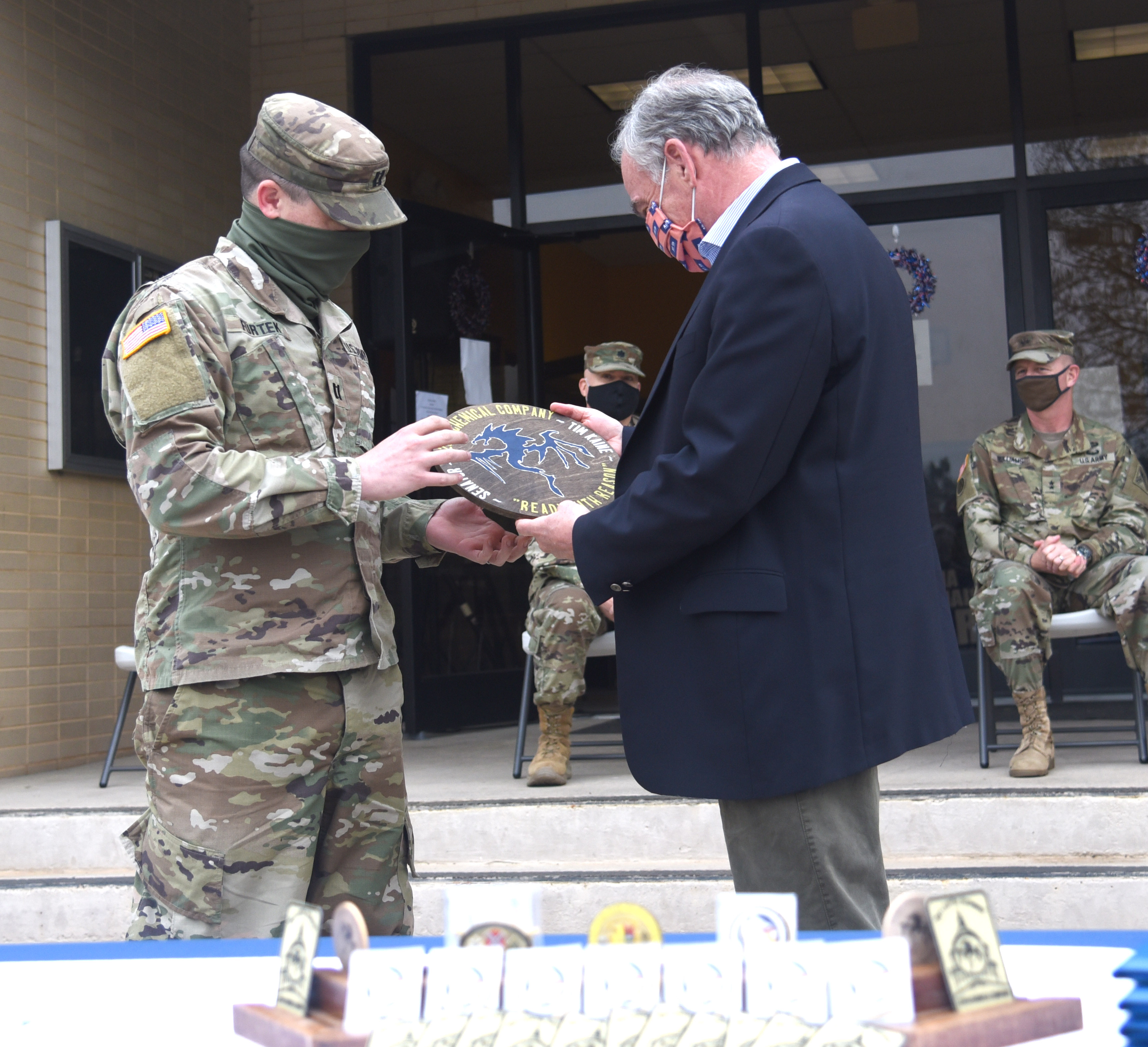 The ceremony was part of a day of celebration after a busy year for the 229th, which included support to Virginia’s ongoing response to the COVID-19 pandemic, as well as support to law enforcement in Washington, D.C., before, during and after the Presidential Inauguration in January 2021. During the event, Kaine thanked the Soldiers and highlighted why their support and service meant a great deal to him personally.